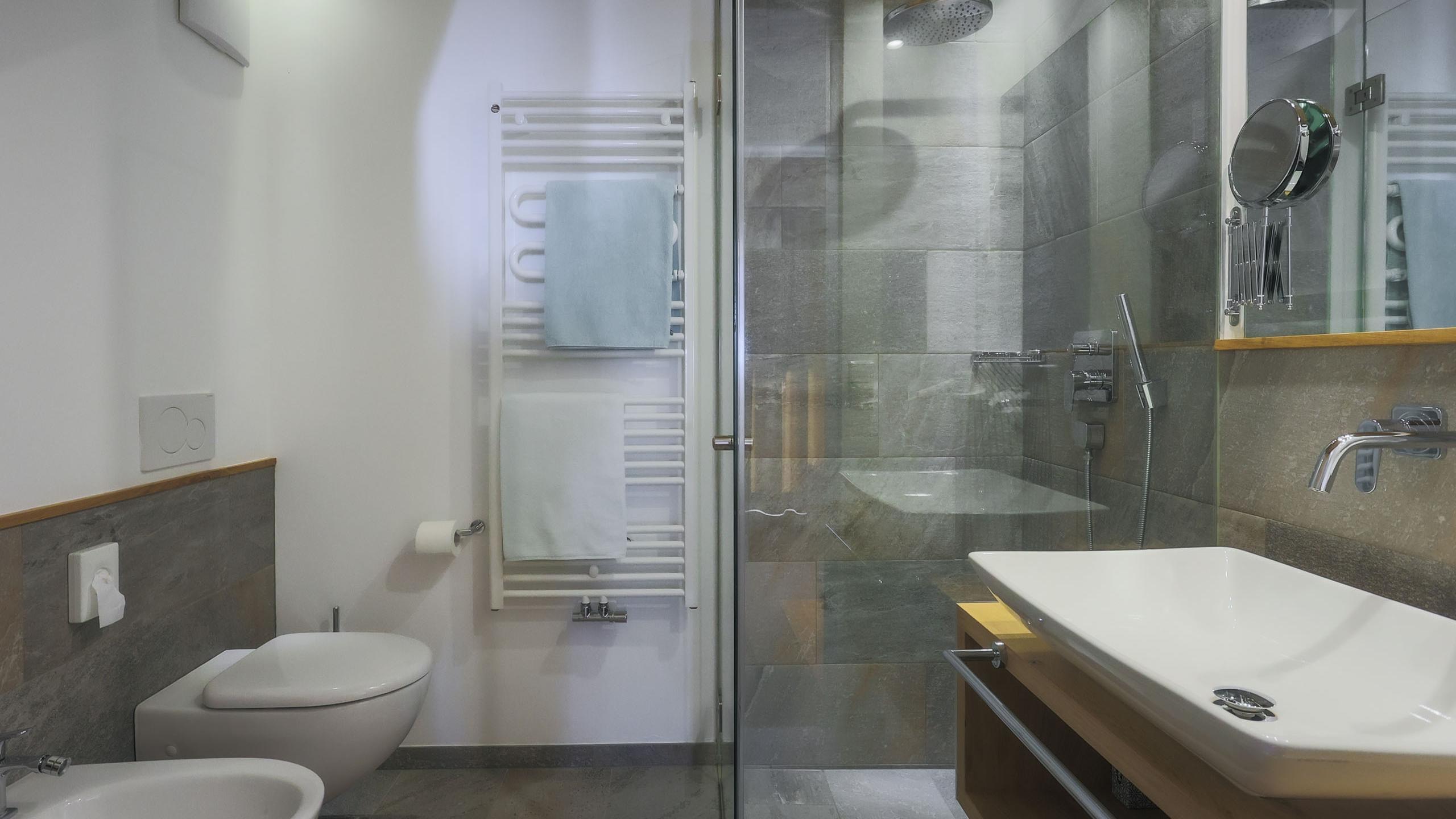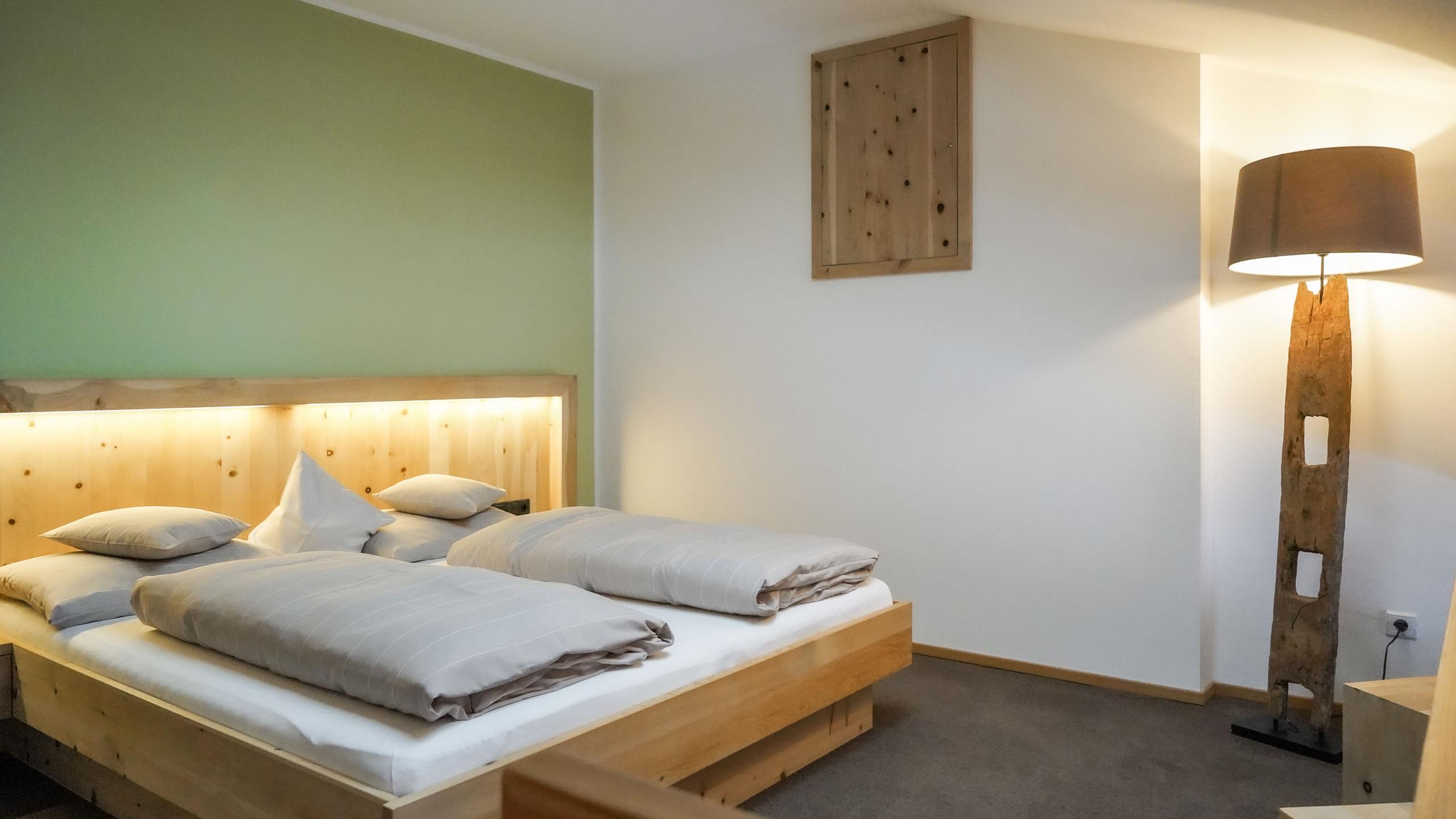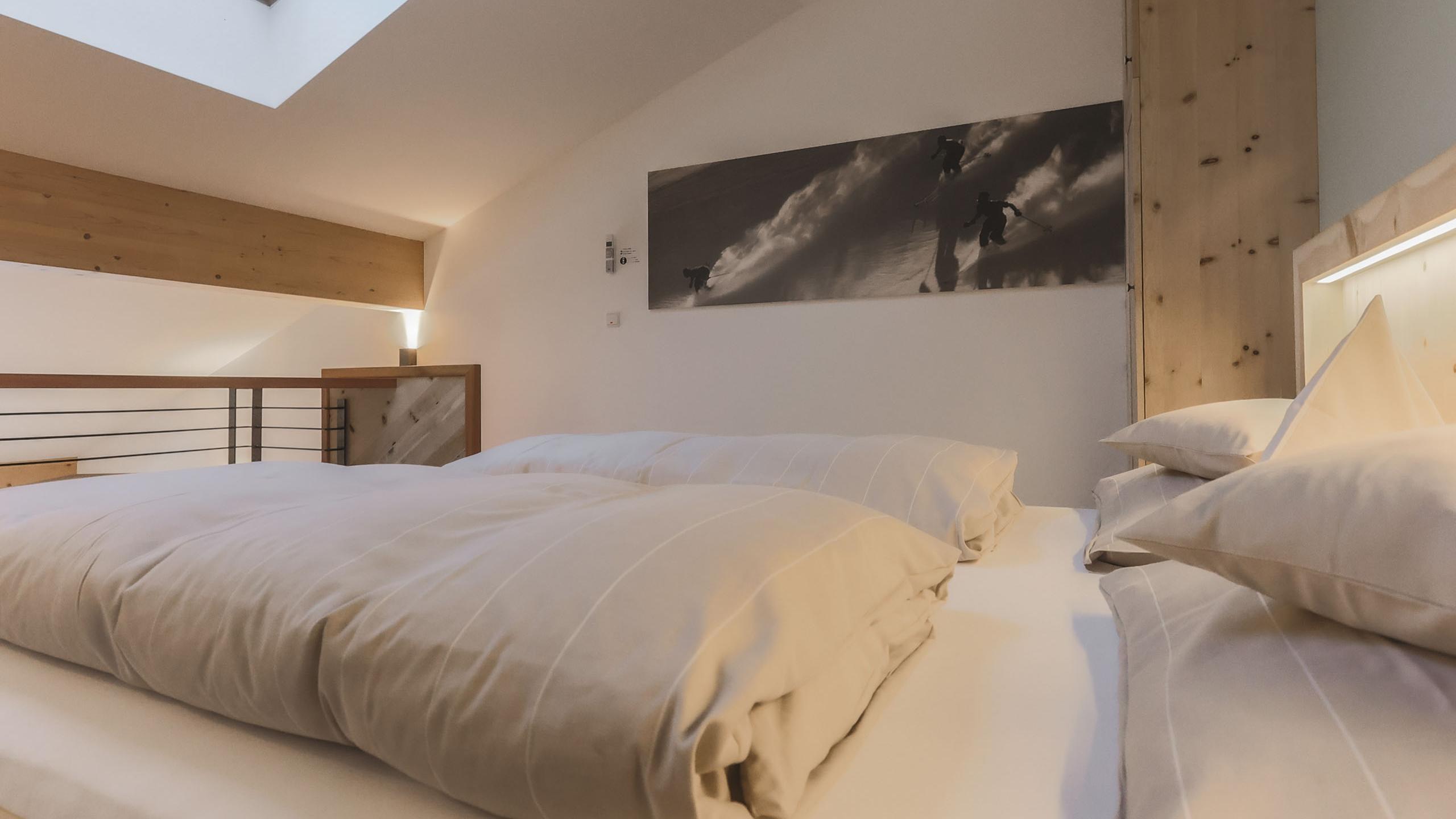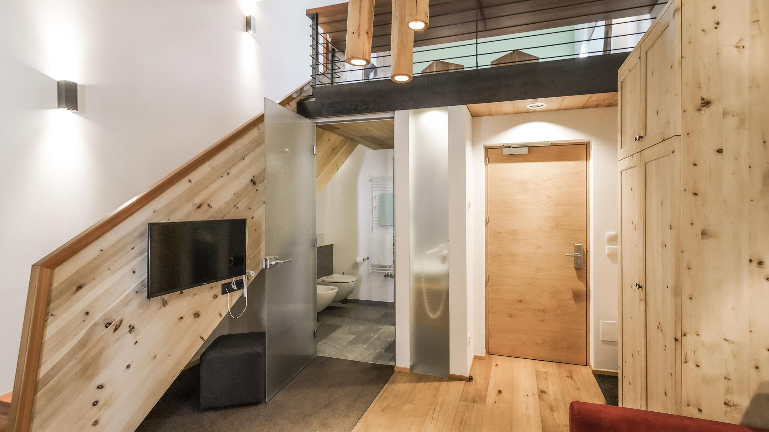 Inviting suite with a cosy double bed, balcony with a view of the local mountain, and a bathroom with a shower.This suite can be connected with the Franz Apartment to create space for up to six people.