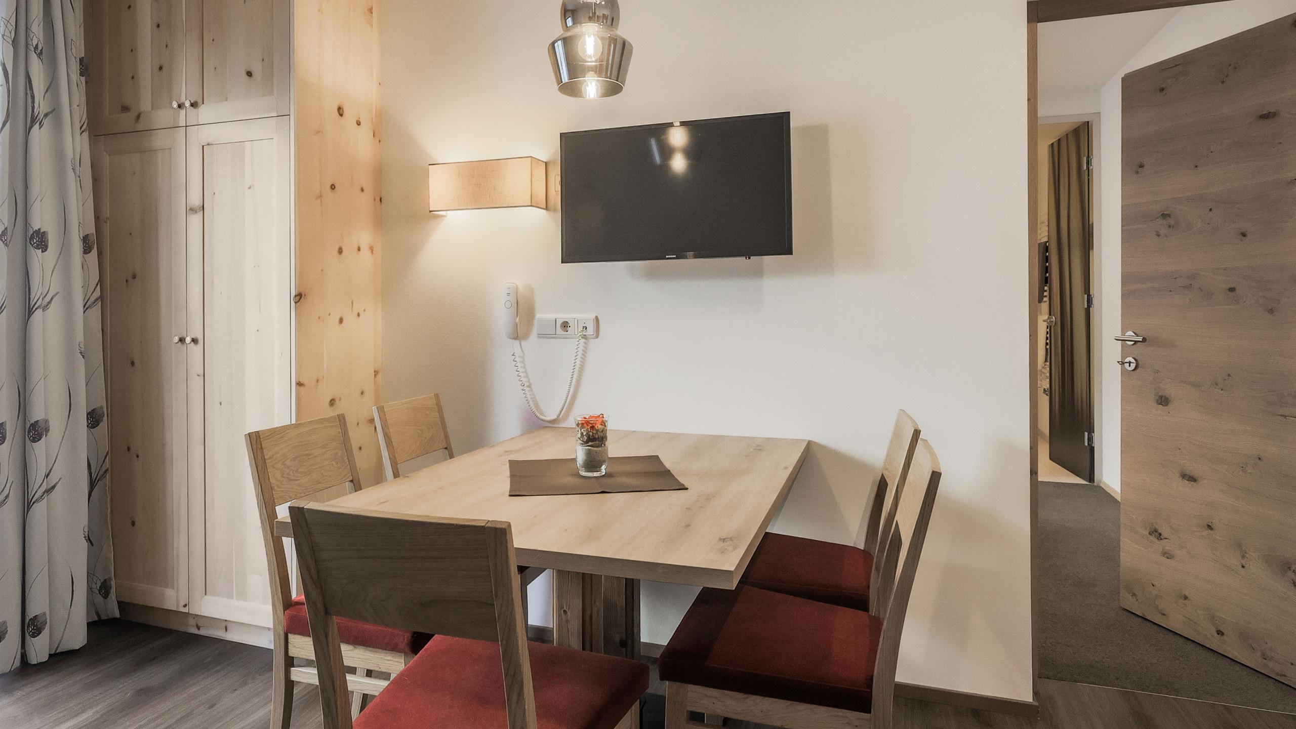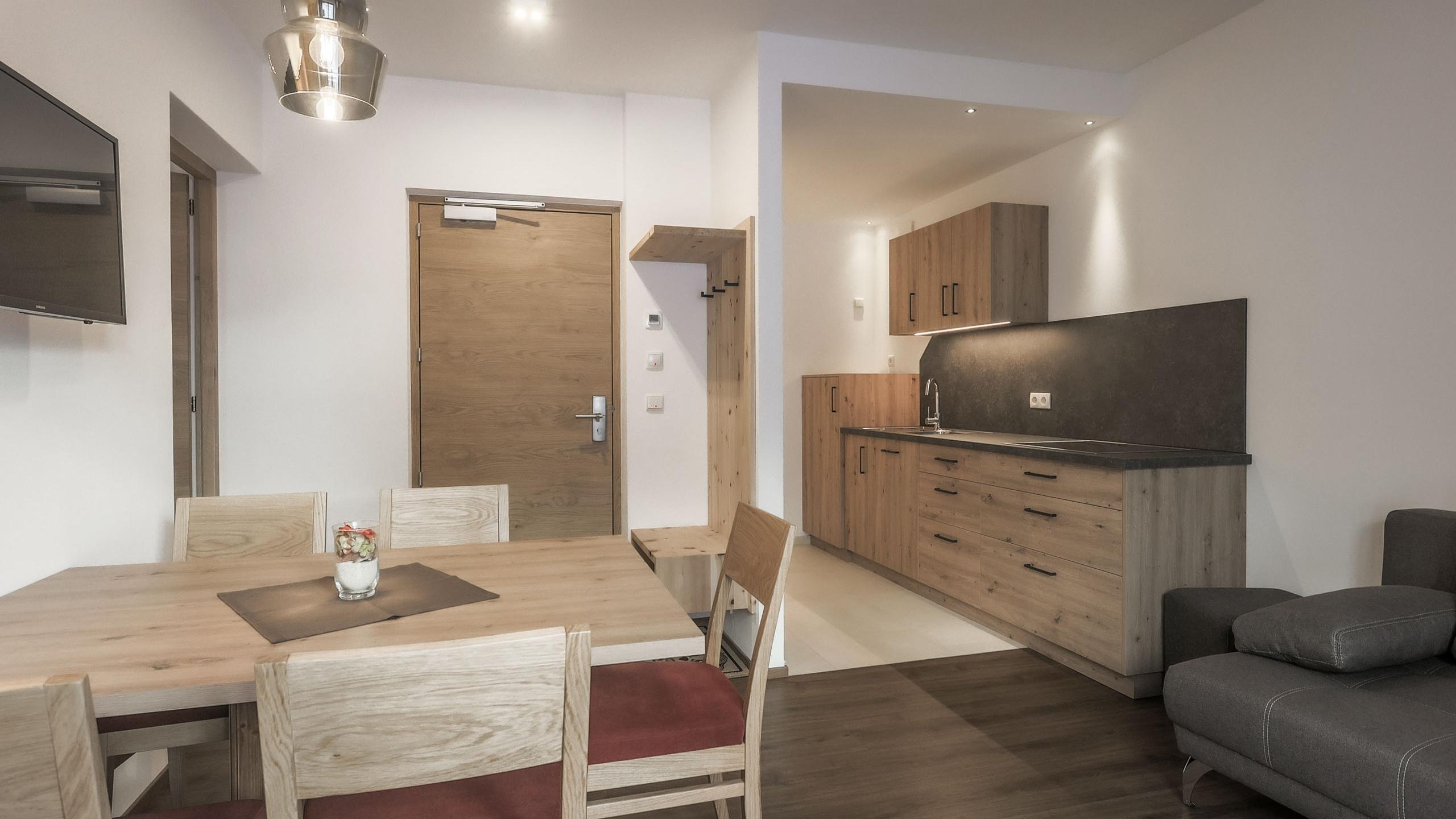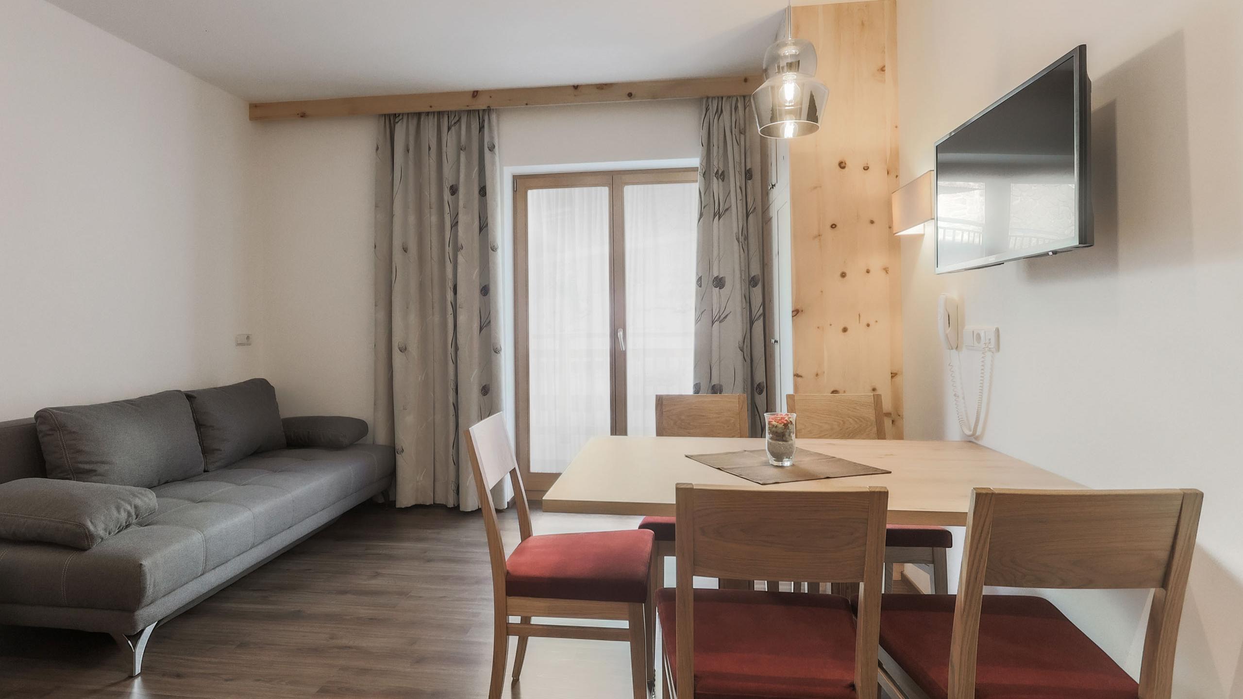Small and charming apartment with an eat-in kitchen, separate bedroom with a double bed, and a balcony with a view towards Durnholz and the valley to the side. The kitchenette has a stove, oven, coffee maker, and kettle. The living area has a cosy seating area, TV, safe, telephone, and Wi-Fi; the bathroom has a large shower.